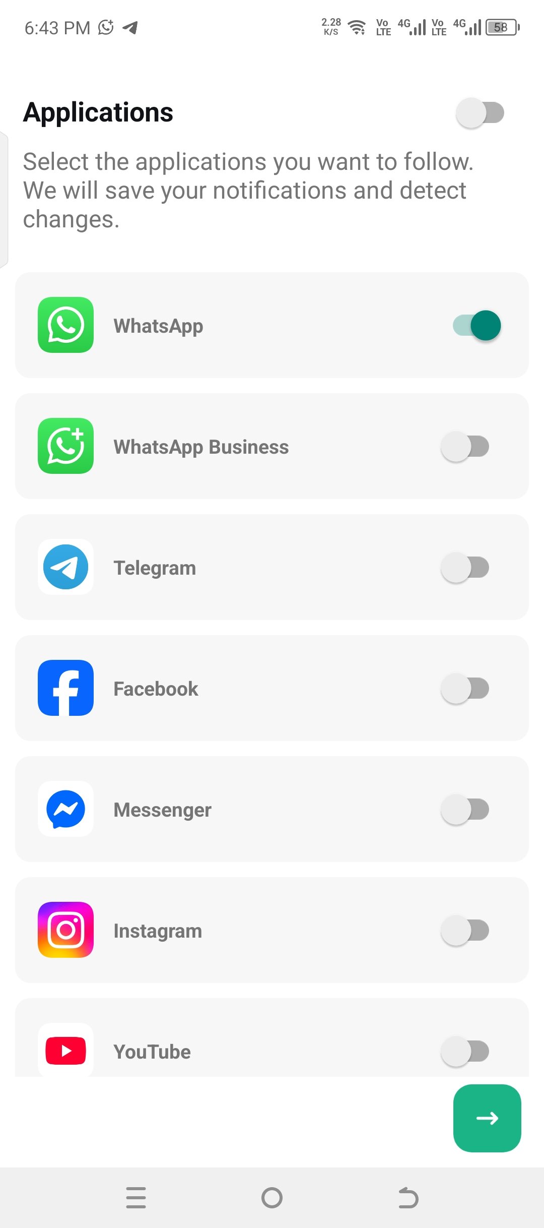 So right now in the skin showed you can see it here is a option you can see when you open application first of all give all the permission he want after giving all the permission you can easily set which application you want to recover messages easily after giving the permission you can easily do anything you want. No I am telling No the WhatsApp is selected and if you want to select more application select from this and turn on the notification. Now if your friend is messages you this application easily turn on the message delete option and you can easily recover it. So now we are going to download process of this application.